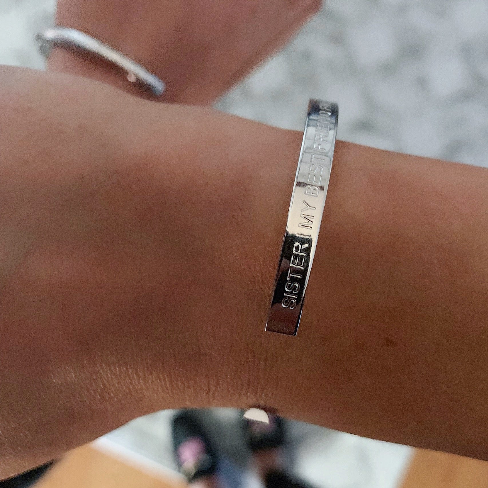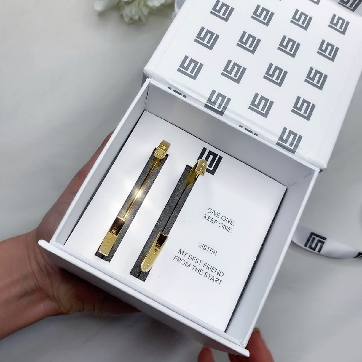 Each bracelet is engraved with SISTER | MY BEST FRIEND FROM THE START and Stella Valle logo