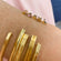 How to put on a Stella Valle bracelet: 1. Grab both sides of the bracelet and pull gently to open. 2. Slide the bracelet on your wrist above your wrist bone. 3. Cup the bracelet and squeeze gently to close.